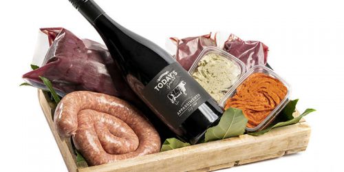Wijn, droge worst, 2 kogelbiefstukken, kruidenboter en een cadeaubon met bedrag naar keuze.