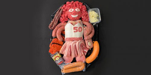 Kogelbiefstukken, katenvlinders, gepaneerde schnitzels, gekruide speklappen, filetlapjes, runderhamburgers, een Broekhuis-biertje, leverworst, rookworst, fuet en een droge worst.